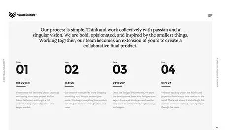 Visual Soldiers和Tomasz Wysocki的网站都是这样,优雅而干练的色调是它们的基因。简练的布局和独特的品牌定位,使得它们无需鲜艳的色彩来呈现CTA按钮和边角的菜单,安静的白与黑就足够了。