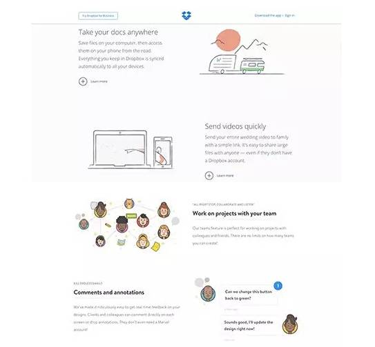 诸如著名的生产力工具Dropbox和Marvel也是这样来进行配色的,Dropbox尤为典型。两个工具都采用了蓝色作为主色调,同时还使用了绿色、橙色和红色来搭配,整个近似色和对比色都有了,几种色彩在一起会给人一种相互搭配良好的感觉。