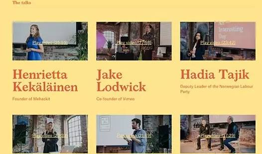 An interesting Day是为一个“在奥斯陆峡湾的小岛上为期一天的奇怪小型会议”而设计的网站。黄色背景上用红色文字的网站并不多见,配合着个性十足的图片,整个网站所有的设计元素都是在为你阐明“奇怪”的特色。